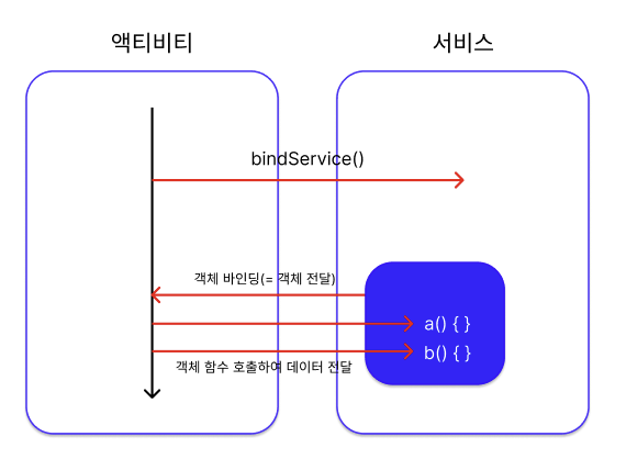 bindService() bindService() 는 startService() 와 달리 서비스와 다른 컴포넌트(주로 액티비티) 간의 데이터 전달 등 상호작용이 원활하게 필요할 때 사용하면 된다.