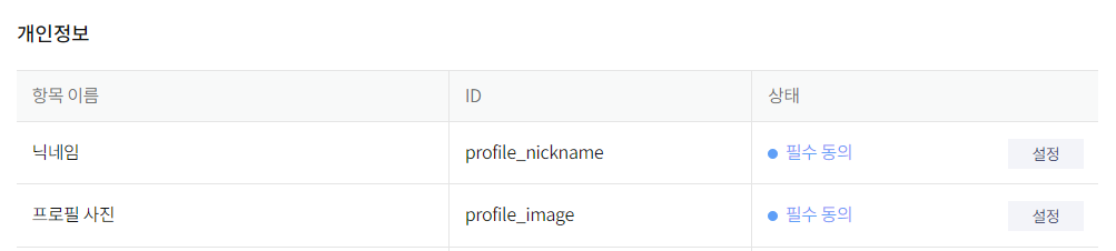 동의항목 사용자로부터 받아올 수 있는 데이터에 대해 동의 단계를 설정할 수 있습니다. 보통 닉네임과 이미지 같은 경우에는 필수 동의로 체크합니다.