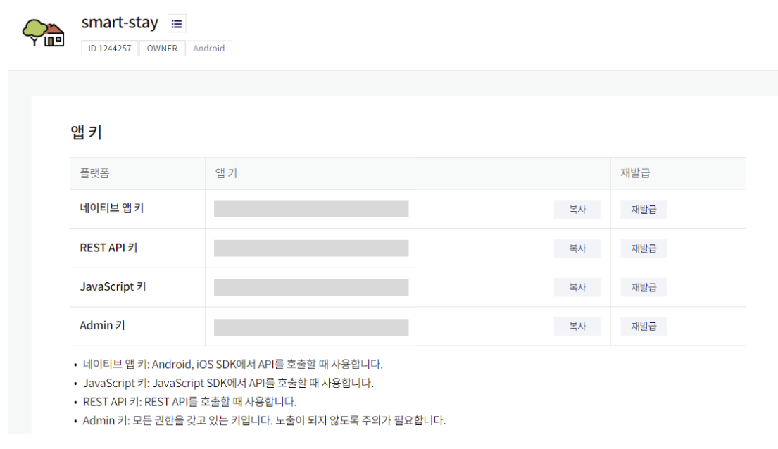 플랫폼 등록을 마치면 이렇게 앱 키가 발급이 됩니다.