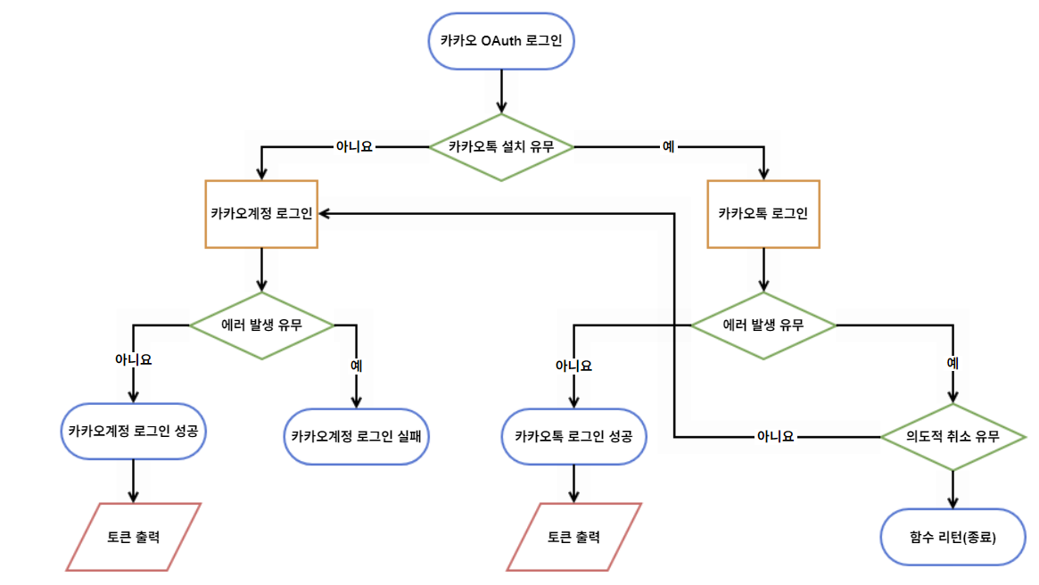 binding.ivKakaoLogin.setOnClickListener { val callback: (OAuthToken?, Throwable?) -> Unit = { token, error -> if (error != null) { Log.e("error", "카카오계정으로 로그인 실패", error) } else if (token != null) { Log.i("error", "카카오계정으로 로그인 성공 ${token.accessToken}") Toast.makeText(requireContext(), "${token.accessToken}", Toast.LENGTH_SHORT).show() } } if (UserApiClient.instance.isKakaoTalkLoginAvailable(requireContext())) { UserApiClient.instance.loginWithKakaoTalk(requireContext()) { token, error -> if (error != null) { Log.e("error", "카카오톡으로 로그인 실패", error) if (error is ClientError && error.reason == ClientErrorCause.Cancelled) { return@loginWithKakaoTalk } UserApiClient.instance.loginWithKakaoAccount(requireContext(), callback = callback) } else if (token != null) { Log.i("error", "카카오톡으로 로그인 성공 ${token.accessToken}") Toast.makeText(requireContext(), "${token.accessToken}", Toast.LENGTH_SHORT).show() } } } else { UserApiClient.instance.loginWithKakaoAccount(requireContext(), callback = callback) } } }저는 코드에 대한 설명을 아래 플로우 차트로 대신 정리했습니다. 저는 개인적으로 플로우 차트 흐름을 먼저 이해한 다음에 코드를 보는게 더 중요하다고 생각합니다.