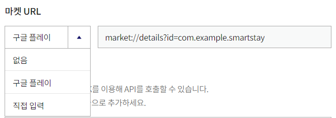 마켓 URL 나중에 앱을 마켓에 실제 등록(배포)할 때 나오는 URL 을 입력하면 됩니다. 아직 등록하지 않은 경우에는 '없음'을 선택합니다.