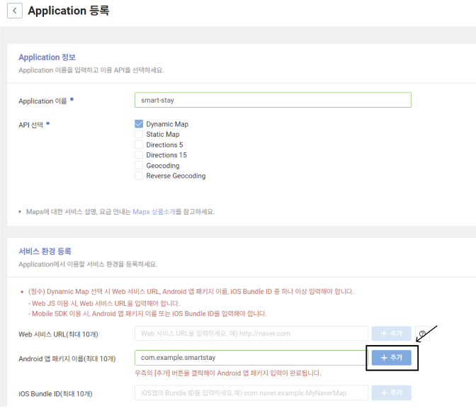 API 선택은 꼭 Dynamic Map 으로 해주어야 합니다. 앱 패키지 이름 옆의 추가 버튼을 누른 후 하단의 등록 버튼을 눌러줍니다.