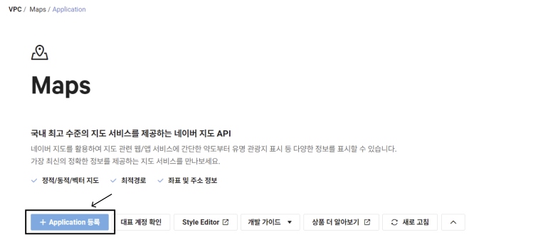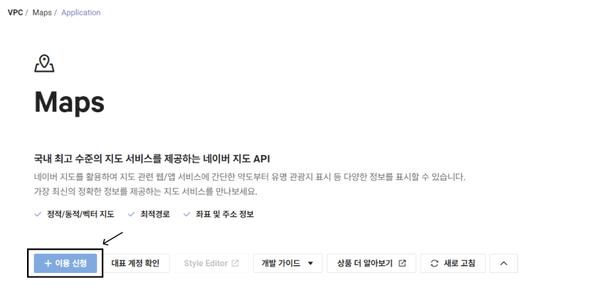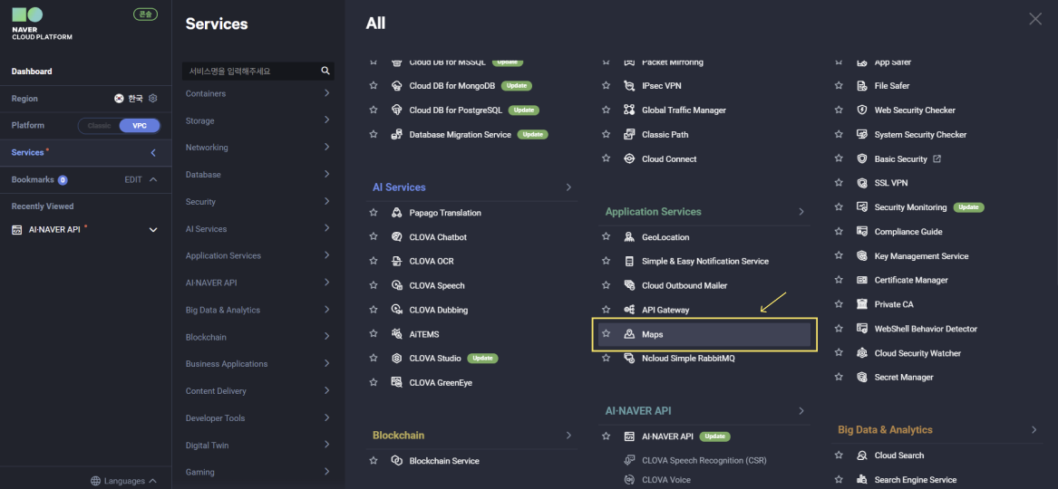 네이버에서 다양한 서비스를 제공해주는데요. 저희는 네이버 지도가 필요하기 때문에 Application Services 에서 Maps 를 선택합니다.