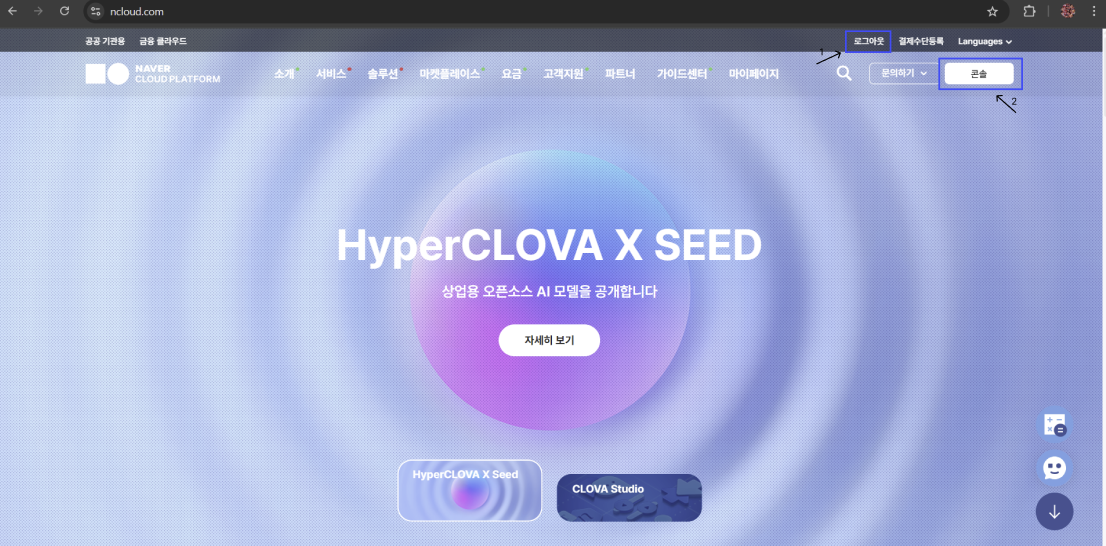 먼저 네이버 클라우드 홈페이지를 접속한 다음, 로그인을 해줍니다. 그 다음에는 콘솔창을 누릅니다.