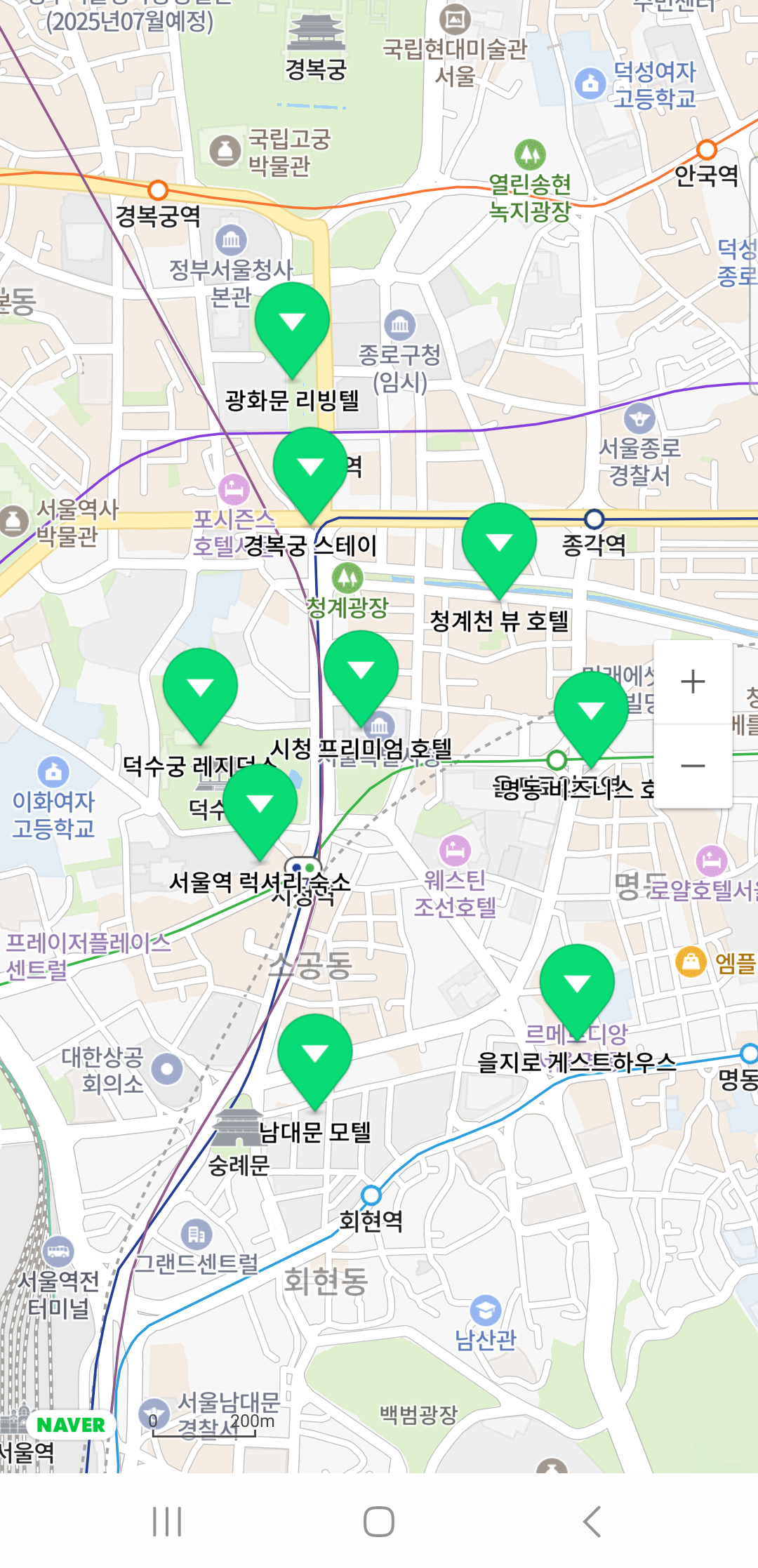 private val dummyData = listOf( AccommodationInfo( name = "시청 프리미엄 호텔", pricePerNight = 120000, address = "서울 중구 세종대로 110", image = R.drawable.img_stay_1, latitude = 37.5665f, longitude = 126.9780f ), ... ) override fun onMapReady(naverMap: NaverMap) { // NaverMap 객체가 준비되면 호출됨 this.naverMap = naverMap // 마커 표시 val markers = dummyData.map { Marker(LatLng(it.latitude.toDouble(), it.longitude.toDouble())).apply { captionText = it.name map = naverMap } } }