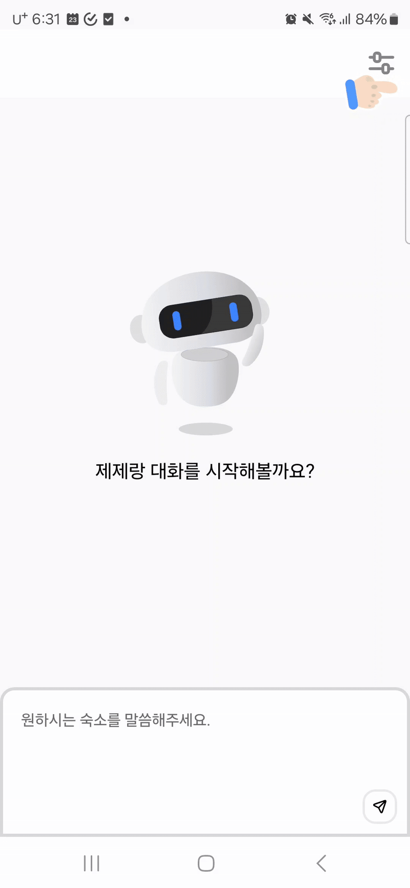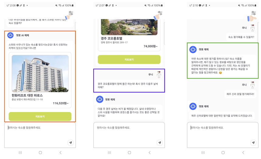 시연 영상 백엔드 연결 당시 찍은 시연 영상으로 올리고 싶었는데 (실제 숙소 추천이 되는 경우) 사용한 사진이 문제가 될까봐 올리기 힘들 것 같아요. 영상 편집이 어려워 블로그 시연영상은 dummy data 로 진행했습니다. (채팅창이 시스템 바까지 침범하는 문제, 입력창이 끝까지 올라가지 않는 부분은 나중에 해결하면 글을 수정하겠습니다)