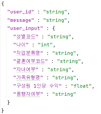 // 서버 쪽에 보내서 챗봇 UI 업데이트 val root = JSONObject().apply { put("user_id", userId) put("message", myText) } val userInput = JSONObject().apply { put("성별코드", userInfo.gender) put("나이", userInfo.age) put("직업분류명", userInfo.job) put("결혼여부코드", userInfo.marriage) put("자녀여부", userInfo.children) put("가족유형명", userInfo.familyCount) put("구성원 1인당 수익", userInfo.income) put("동행자여부", userInfo.isCompanionExist) } root.put("user_input", userInput) val requestBody = root.toString().toRequestBody("application/json; charset=utf-8".toMediaType()) val okHttpClient = OkHttpClient() val request = Request.Builder().url("${BASE_URL}receive").post(requestBody) .build() okHttpClient.newCall(request).enqueue(object : Callback { override fun onResponse(call: Call, response: Response) { if (response.isSuccessful) { val response = response.body?.string() val gson = Gson() val chatBotMessage = gson.fromJson(response, ChatModel.ChatBotMessage::class.java) chatItemList.add(chatBotMessage) chatAdapter.submitList(chatItemList.toList()) } else { .. } } override fun onFailure(call: Call, e: IOException) { .. } })