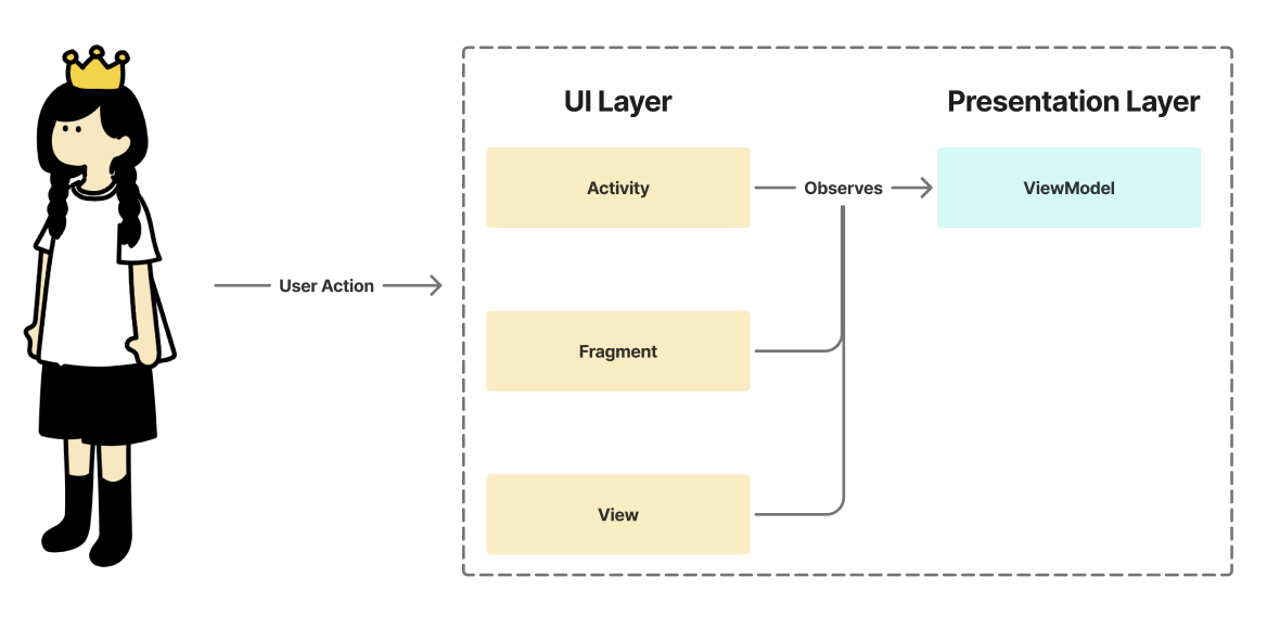 UI 레이어는 User Interface 레이어의 준말입니다. Presentation 레이어와 상호작용하는데, viewmodel을 통해 데이터를 받아와 화면 UI에 표시하거나 사용자의 액션을 viewModel로 전달하는 인터페이스 역할을 합니다.