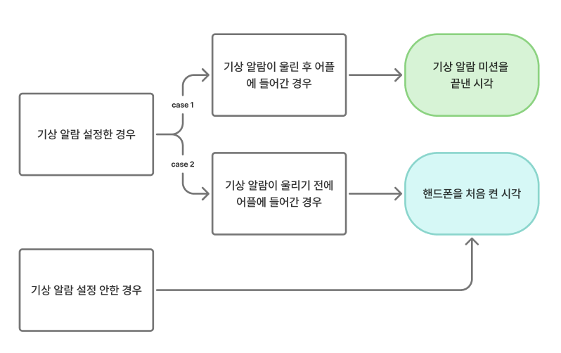 사용자가 일어난 시점 기준 이걸 보여드린 이유는, 사용자가 일어난 시각을 핸드폰을 처음 켠 시각으로 볼 수도 있고, 기상 알람 미션을 끝낸 시각으로 볼 수도 있기 때문입니다. 저희는 여기서 포스팅 주제에 맞게 핸드폰을 처음 켠 시각으로 가정하여 진행하겠습니다.