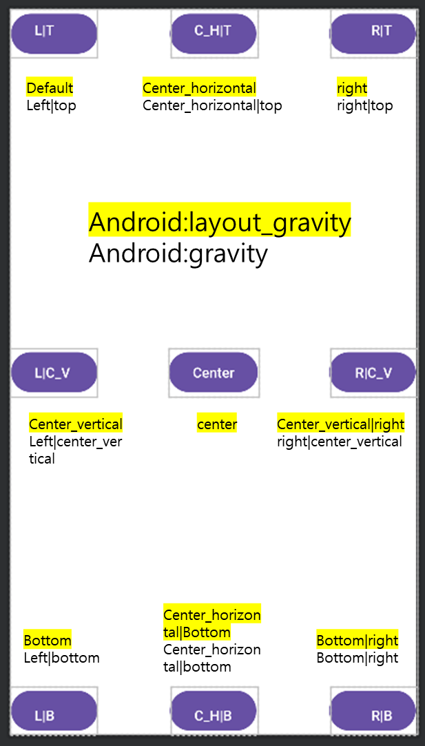 android:layout_gravity → 부모 뷰 안에서 해당 뷰(위젯)의 정렬 방식 지정