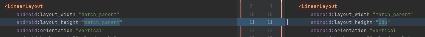왼쪽 - 내 코드, 오른쪽 - 해설 코드 세개의 레이아웃의 비유링 같은 경우 0dp 로 설정하면 알아서 같은 비율로 화면에 채워진다