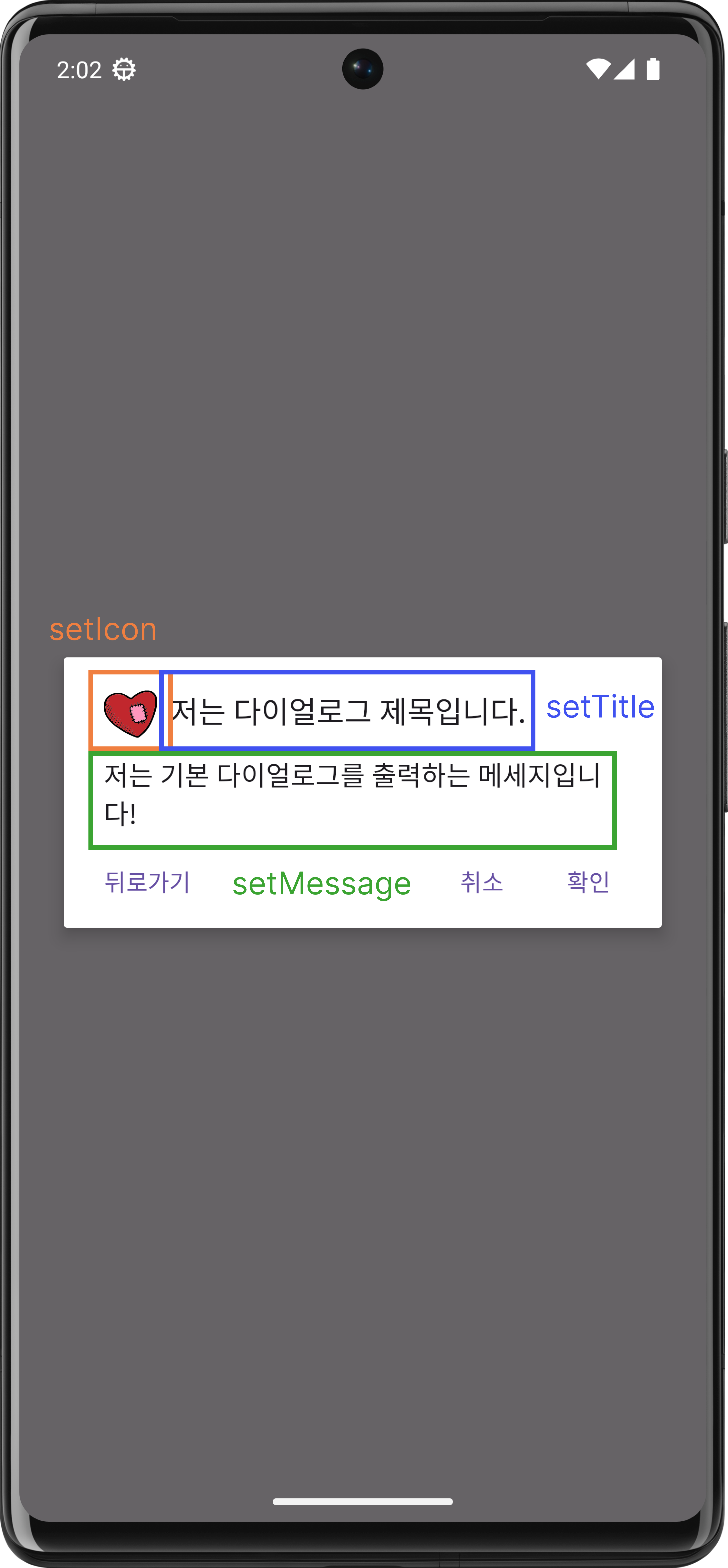이후에는 해당 객체의 setTitle, setMessage, setIcon 메소드를 사용해 UI를 변경할 수 있다.