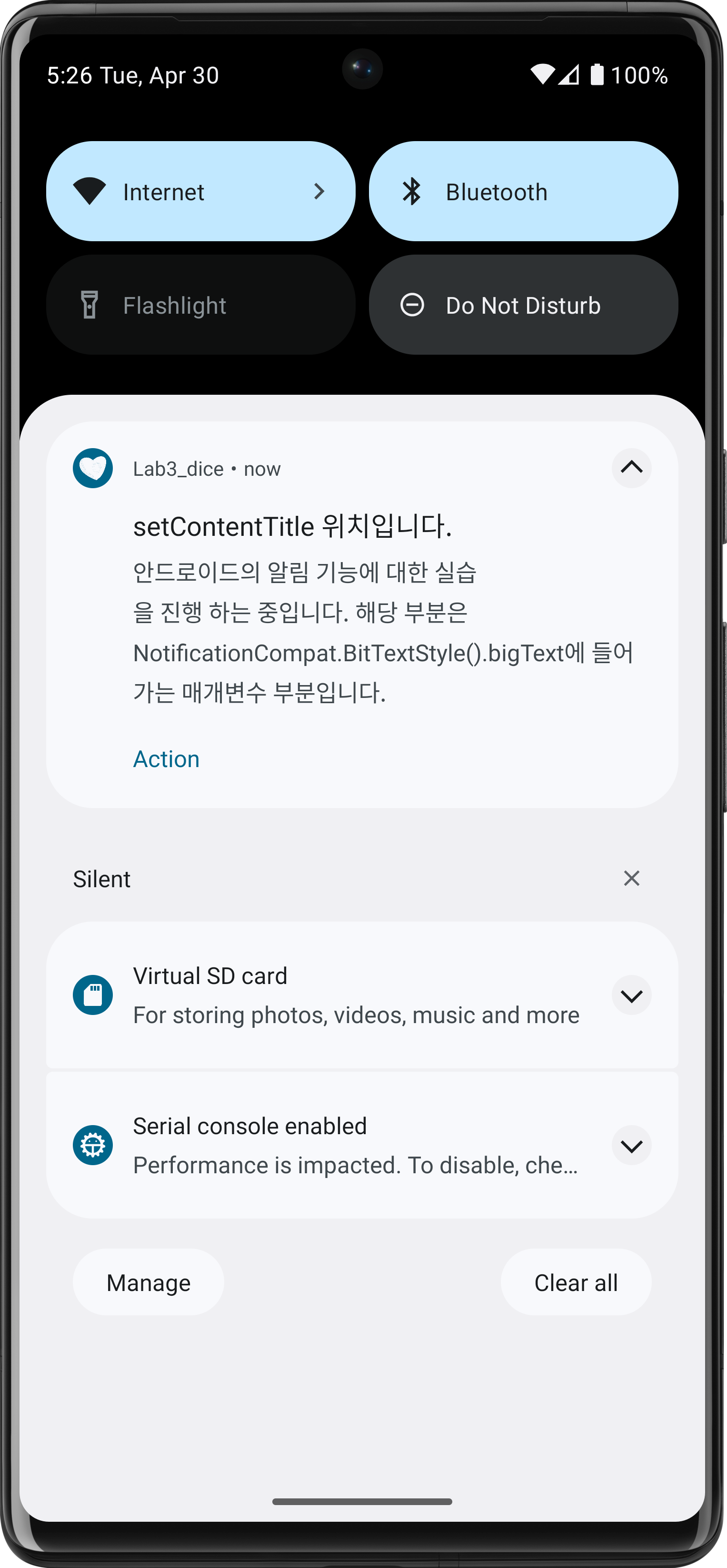 builder.run { setSmallIcon(R.drawable.ic_heart) setWhen(System.currentTimeMillis()) // 프로젝트에서 알림 발생 시간 늦추는 부분 해당 코드 건드린 것 같음 setContentTitle("setContentTitle 위치입니다.") setContentText("setContentText 위치입니다.") setStyle( NotificationCompat.BigTextStyle() .bigText("안드로이드의 알림 기능에 대한 실습을 진행 하는 중입니다. 해당 부분은 NotificationCompat.BitTextStyle().bigText에 들어가는 매개변수 부분입니다.") ) setLargeIcon(bitmap) addAction(R.drawable.ic_search, "Action", pendingIntent)// 알림을 눌렀을 때 액션 수행 } manager.notify(11, builder.build())